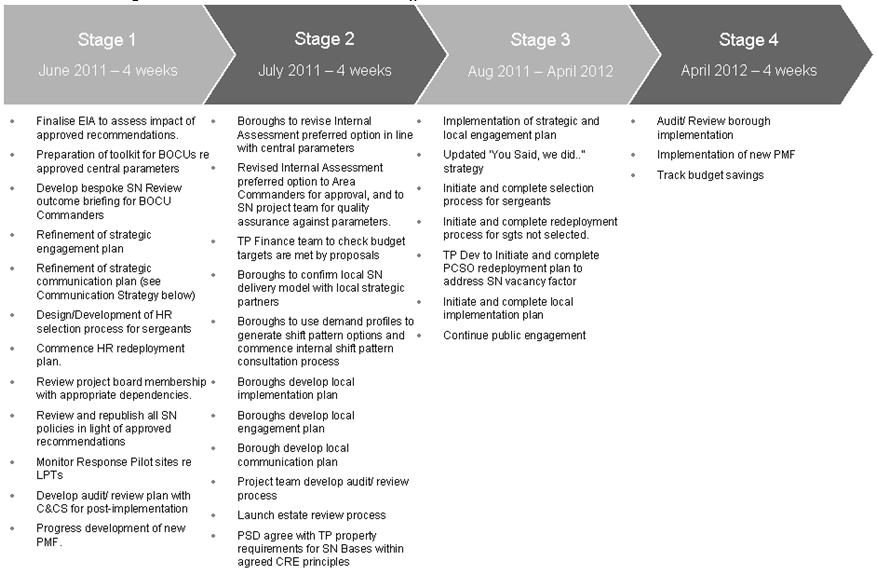 59. The transition to the developing model of Safer Neighbourhoods, as approved by Management Board, will be through the TP Development Programme, on a project management basis using a four stage approach (see figure)