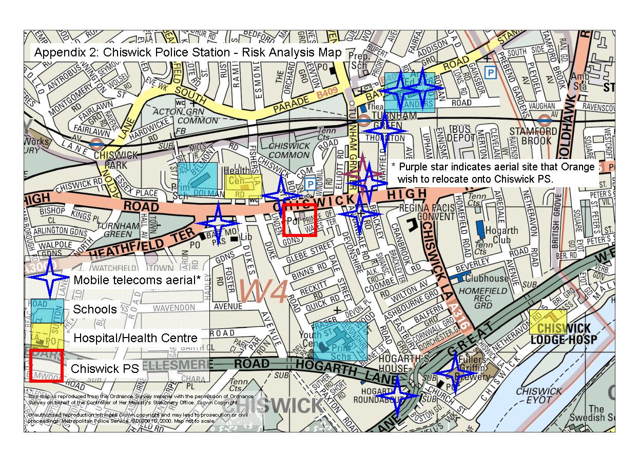 8. Schools are shown by the blue shaded boxes, with the health centre and hospital in the yellow shaded boxes. In each case there are other aerials much closer to them, and the area as a whole has a range of aerials for various operators (MM02, Hutchison 3G and Orange are known to occupy sites). A number of those aerials located on Chiswick High Road are transmitters placed at street level, much closer to residents than a mast on the police station roof.