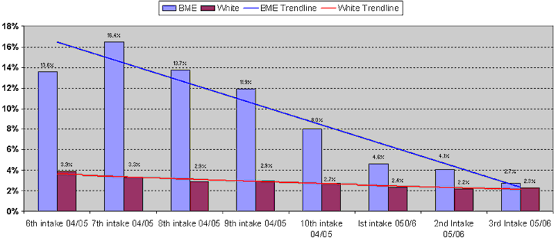 5. 751 students have been attested through training school between April and November this year of which 16% were from black and ethnic minority communities. As illustrated in Appendix 2, the attrition rate among black and minority ethnic recruits has reduced markedly and is now the same as that for white recruits. It is all the more pleasing that the most recent figures show that this improved performance is being maintained.