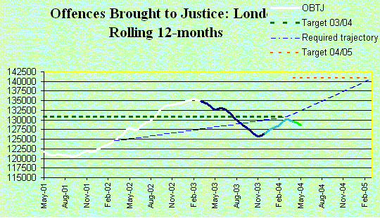 7. Offences Brought to Justice (OBTJ) is a cross agency target and consists of 75% conviction data. Historically this has been a difficult indicator to collect data on. Current measurement relies on the thirty GLMCA Courts across London and the five Crown Courts submitting their conviction data for us to process before passing it to the Home Office. This is time consuming and results in a six-month data lag; it is being urgently addressed. Since September 2003 there has been a marked increase in the number of detections from 13% in September 2003 to 18.8% in March 2004.
