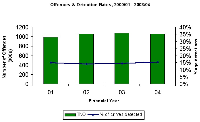 The overall detection rate has improved from 14.4% in July 2003 to 16.9% in July 2004 (for the rolling 12-month period). The longer perspective, since April 2000, is of broadly static crime around one million offences per year, and a detection rate around 15%.