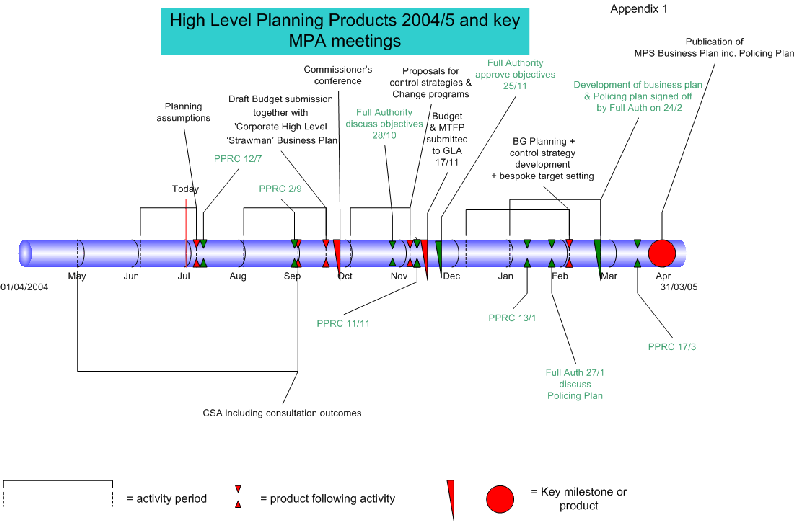 1. The purpose of this report is to provide members of the MPA with an insight and understanding of the key stages of the planning process for the policing and performance plan 2005/6. This year’s planning process involves a different approach in that the current process takes into account a number of recommendations from the (MPA) internal audit and the Audit Commission and in particular is intended to be compliant with the National Intelligence Model (NIM).