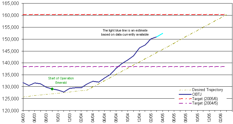 19. In the last week, the Home Office has reviewed and agreed London's OBTJ performance for year ending 31 March 2005. London achieved a total of 150,959 against a target of 138,373.