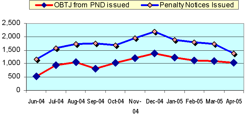 26. The following charts show the quantity of Penalty Notices for Disorder issued per month and what is the OBTJ contribution.