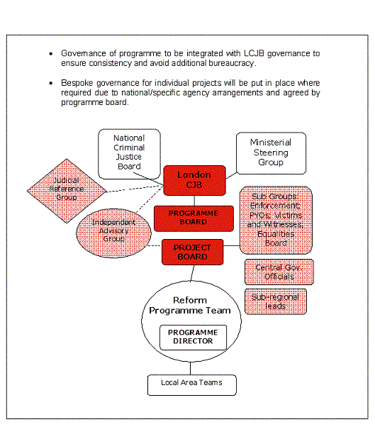 | Purpose The Programme Board will be responsible for delivering the London Reform Programme, through the Programme Director and Programme Team. The Programme Board includes in its scope all programmes and projects designated as within the overall London Reform Programme, the London CJB project board and the following sub-groups: central officials group; and sub-regional leads. (Other groups have wider remit & report to LCJB) |